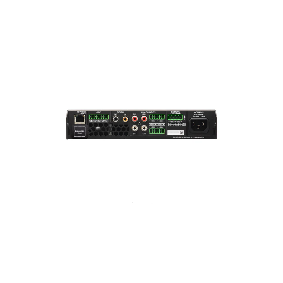 Con una potenza totale di sistema di 125 W, supporta configurazioni Lo-Z (4Ω / 8Ω) e linee distribuite 70V/100V. Il DSP full-matrix integrato consente gestione avanzata di equalizzazione, routing e ottimizzazione del sistema.