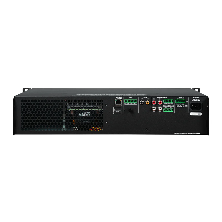 Con una potenza totale di sistema di 1500 W, supporta configurazioni Lo-Z (2Ω / 4Ω / 8Ω) e linee distribuite 70V / 100V, consentendo installazioni ad alta densità di diffusori o pilotaggio di subwoofer e cluster ad elevata richiesta energetica.